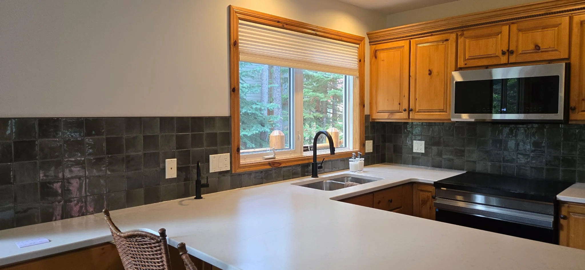 I loved the original green accents, so I kept the green but moved it to the walls as a wrap-around backsplash, then brightened the counters with a light grey quartz. We also added a small coffee bar to ease congestion in the kitchen — a simple solution that works beautifully when multiple families are staying together.